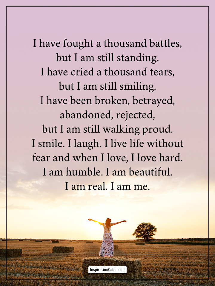 I have fought a thousand battles, but I am still standing. I have cried a thousand tears, but I am still smiling. I have been broken, betrayed, abandoned, rejected, but I am still walking proud. I smile. I laugh. I live life without fear and when I love, I love hard. I am humble. I am beautiful. I am real. I am me.