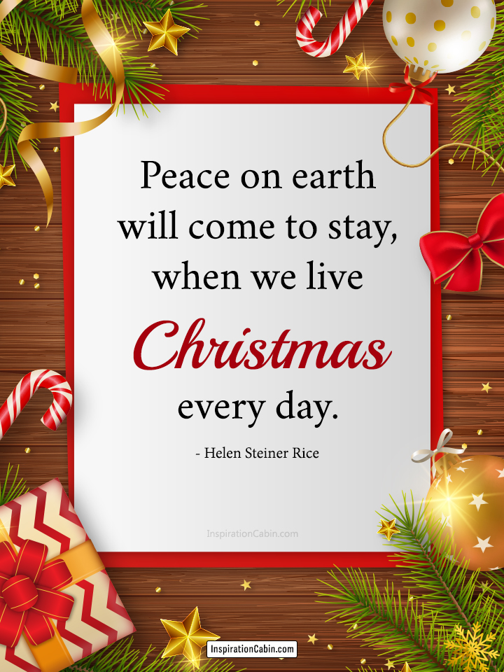 December 20, 2025 admin Peace On Earth Peace on earth will come to stay, when we live Christmas every day. ~ Helen Steiner Rice Share this:Click to share on Twitter (Opens in new window)Click to share on Facebook (Opens in new window)Click to share on Pinterest (Opens in new window)Like this:Like Loading...