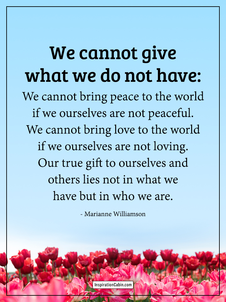We cannot give what we do not have: We cannot bring peace to the world if we ourselves are not peaceful. We cannot bring love to the world if we ourselves are not loving. Our true gift to ourselves and others lies not in what we have but in who we are.
