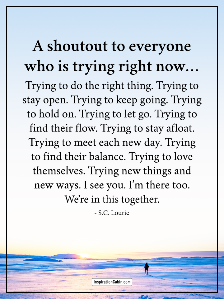 A shoutout to everyone who is trying right now… Trying to do the right thing. Trying to stay open. Trying to keep going. Trying to hold on. Trying to let go. Trying to find their flow. Trying to stay afloat. Trying to meet each new day. Trying to find their balance. Trying to love themselves. Trying new things and new ways. I see you. I’m there too. We’re in this together.