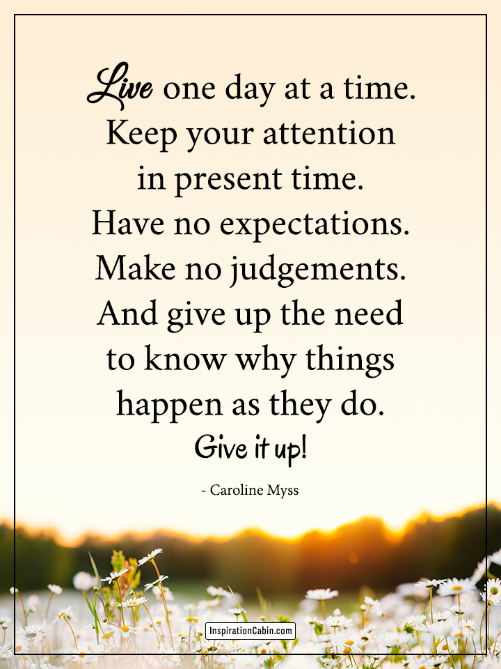 Live one day at a time. Keep your attention in present time. Have no expectations. Make no judgements. And give up the need to know why things happen as they do. Give it up!